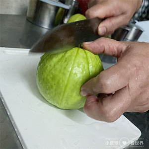 謝家每一顆大小都差不多大~都快比肉球的臉還大了, 切開就可以聞到很香的芭樂味道,切開就知道好不好吃,甜甜的味道傳出來。一顆切8片(我家2隻愛吃水果的孩子,一顆剛剛好)
