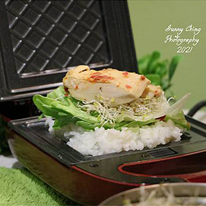 把米飯、自己喜歡的蔬菜、「川味麻辣」雞胸肉一起放置鬆餅機裏頭壓製成"米漢堡",也是一種不錯的飯類料理喔!但建議用隔夜飯或是較乾燥的飯來做,比較不會黏機台。