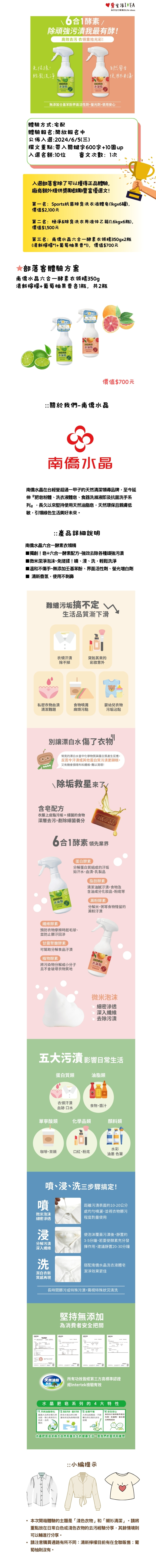 第一名王O心Sports抗菌除臭洗衣液體皂1kgX6罐(一箱),價值2100元第二名王O婷極淨&除臭洗衣用液体1.6kgx6瓶(一箱),價值1500元第三名蕭O綱南僑水晶六合一酵素衣領精350g-清新檸檬*1+葡萄柚果香*1,價值700元